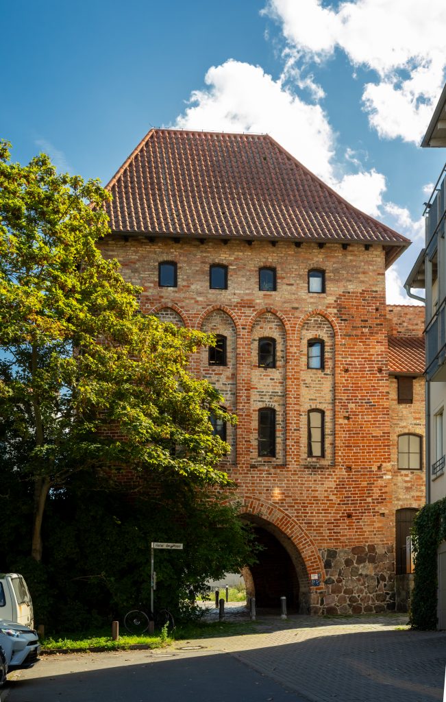 Mit dem Auto verlassen Sie die A19 an der Ausfahrt „Rostock-Süd“ und fahren dann Richtung Innenstadt. Überqueren Sie die Warnow und folgen Sie dem Straßenverlauf bis zu einer mehrspurigen Vier-Richtung-Kreuzung. Biegen Sie rechts ab Richtung Steintor. Fahren Sie dann (statt links abzubiegen) geradeaus an der linken Seite des Steintors vorbei und biegen Sie vor dem Neuen Markt rechts ab. Folgen Sie dem Straßenverlauf talwärts, bis Sie kurz vor der Talsohle rechter Hand einen kleinen Parkplatz und dahinter das Kuhtor sehen.